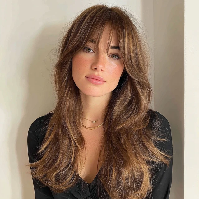 Why It Works: Curtain bangs paired with long layers create softness and shape without losing length. They frame the face, add interest, and make hair look instantly fuller.