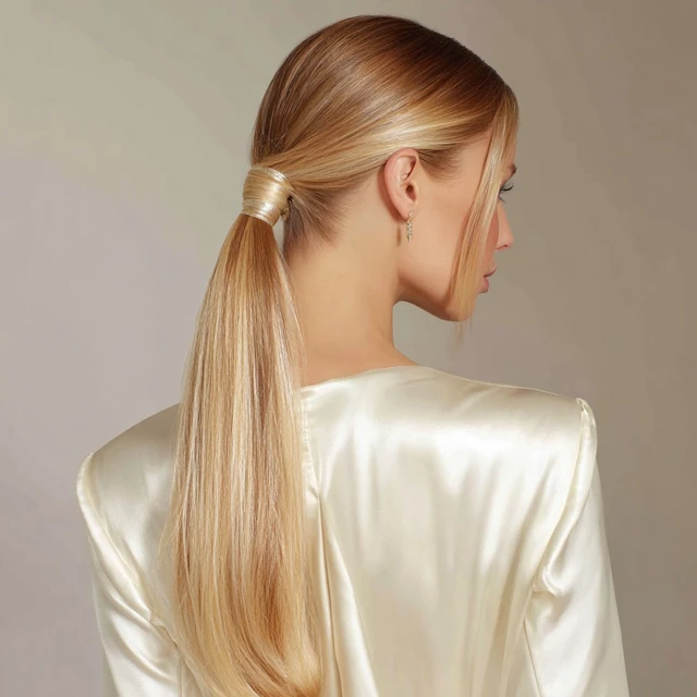 Why It Works: Elegant, understated, and incredibly easy to create. A long, straight pony looks chic when tied low and accented with a hair wrap.