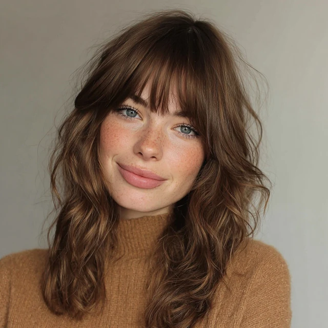 Why It Works: Bangs soften the face and add a retro-yet-modern feel, while the layers let waves breathe.