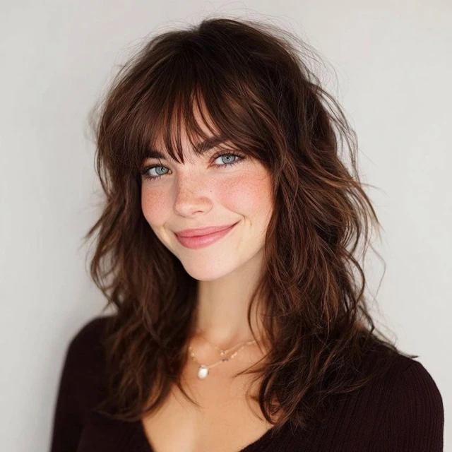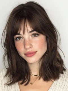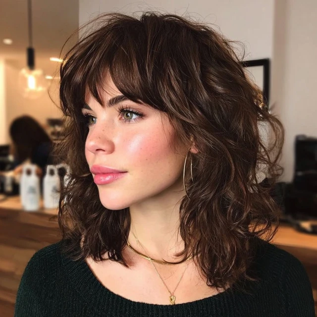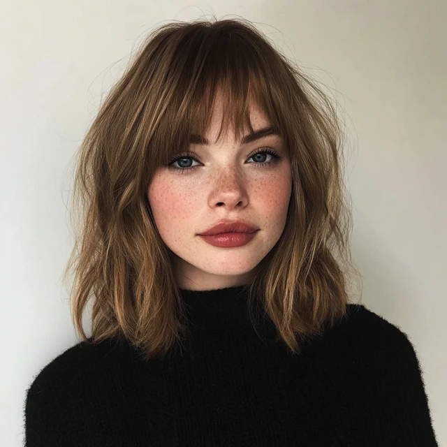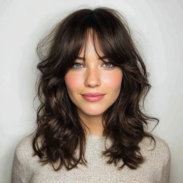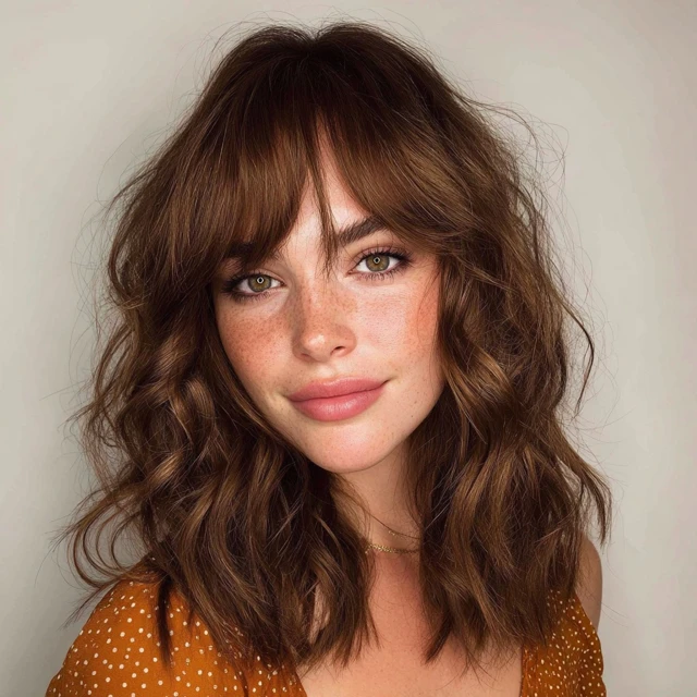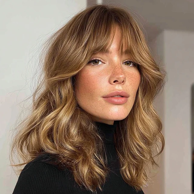 Why It Works: Curtain bangs frame your face beautifully and blend seamlessly into medium waves, giving a retro-meets-modern vibe.